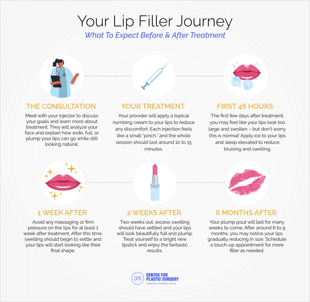Curious about lip fillers but not sure what to expect from treatment? The graphic below outlines the general timeline of what happens before, during, and after lip augmentation.